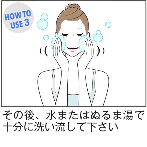 ●泡ができたら顔にのせ、顔をこすらず、泡を密着させるようにゆっくりと優しくメイクとなじませ、3-4分間軽く泡でマッサージするように洗ってください。