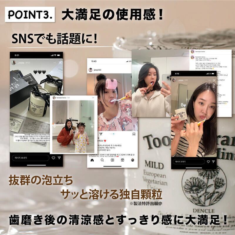 デンクル トゥースグラニュールの開発は、歯科医師と研究者が共同で行いました。天然成分のみを使用し、口腔内環境に配慮しながら、歯の健康をサポートする商品を目指しています。日々の歯磨きが楽しくなるよう、心地よいテクスチャーや香りにもこだわっています。